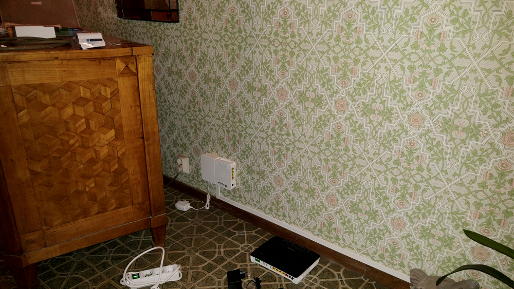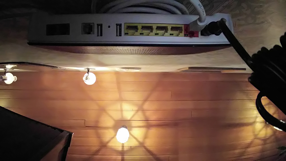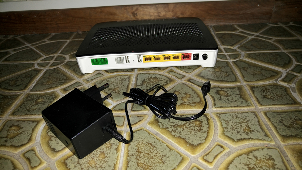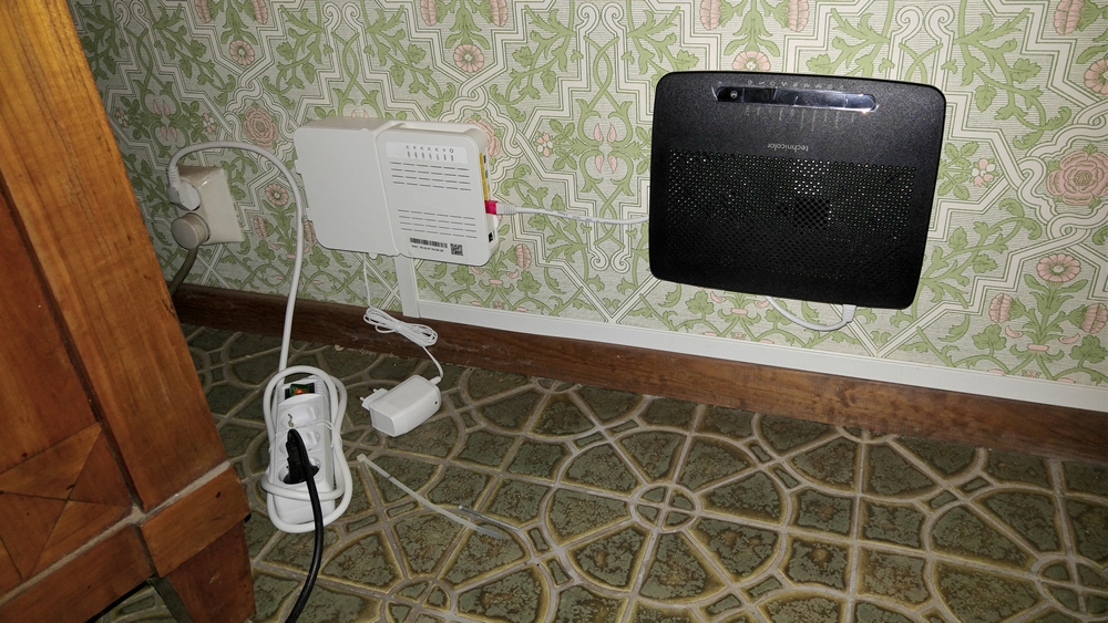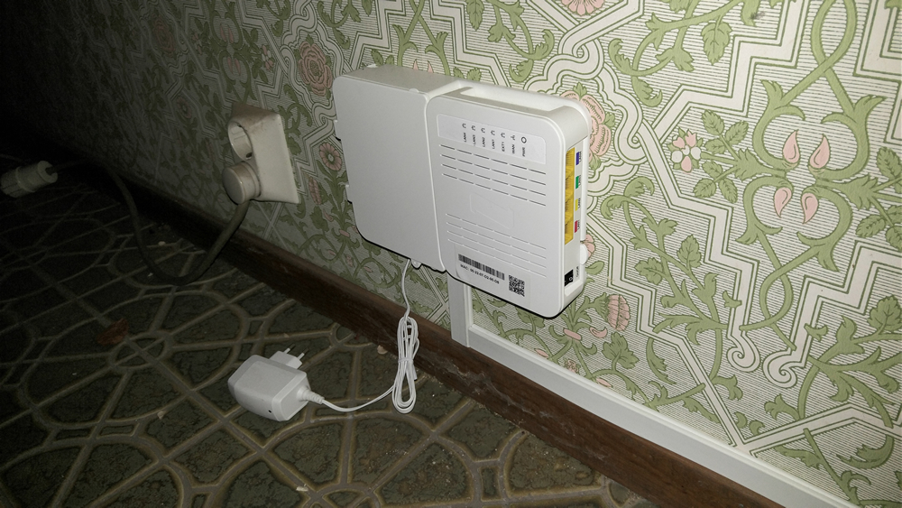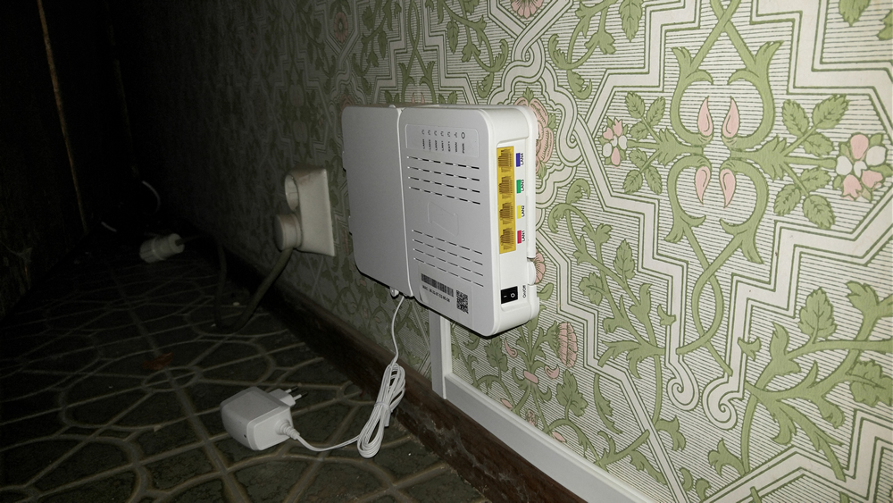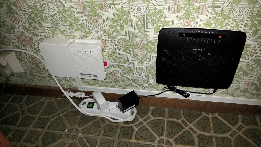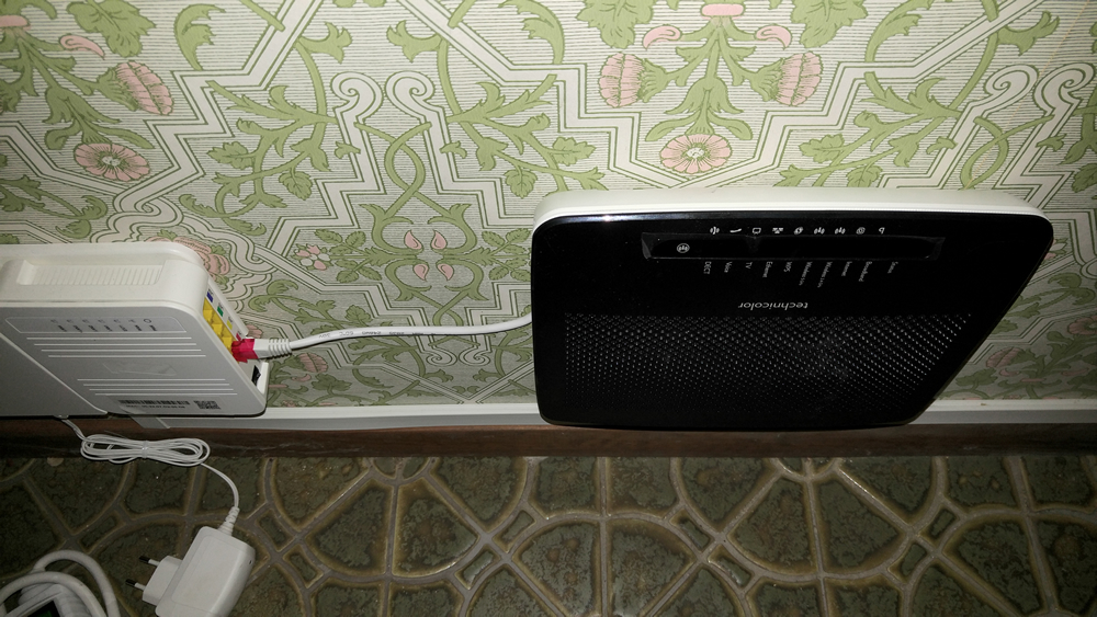 Bilden visar installation av bredband via fiberoptik hemma hos en kund på Djursholm utanför Stockholm. Internet ansluts till röd port. Digitalbox ansluts till gul port.